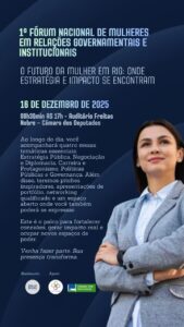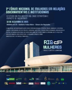 Será realizado na próxima terça-feira, 16 de dezembro de 2025, das 8h30 às 17h10, no Auditório Freitas Nobre, na Câmara dos Deputados, o 1º Fórum Nacional de Mulheres em Relações Governamentais e Institucionais, com o tema “O Futuro da Mulher em RIG: Onde Estratégia e Impacto se Encontram”.